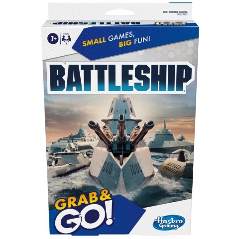 Lead your fleet to victory on the move with this compact Battleship Grab and Go game! It features the same classic Battleship gameplay in a travel-size format. Can you sink your opponent's ships before all of yours go down? Command your battle from the flip-open game unit and deploy your carrier, battleship, submarine, destroyer and cruiser on the ocean grid. For ages 7 and up, this portable travel game for 2 players is great for playing the Battleship game just about anywhere on the go. It's easy to set up and comes with built-in storage. When the battle is over, store the pegs in the units and slide them together. Rule the oceans with the Battleship Grab and Go game!