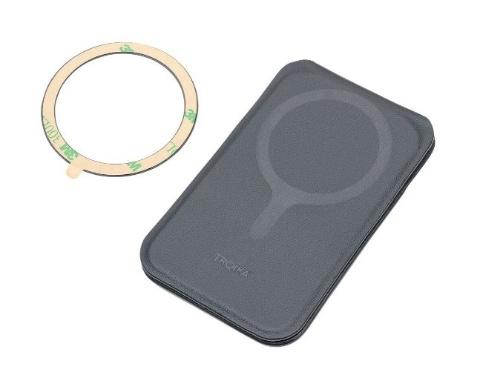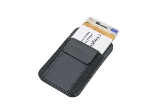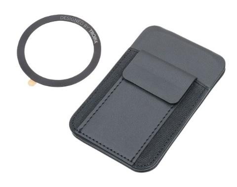 Card case MagSafe, stretch pocket for 2-5 cards, key compartment, compartment for 1 credit card inside, compartment for banknotes, magnetic attachment with N52 magnet on the smartphone, stand-up functions for horizontal and vertical positioning of the smartphone, additional metal ring with 3M adhesive strip for mounting to all common smartphones, notebooks, etc., metal / polyurethane, Black
