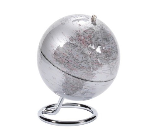 - Attractive design: Glossy two-tone globe GALILEI (13 cm diameter) with silver country areas and silver seas, labeled in English with continents, oceans, countries, geographical zones and important cities.