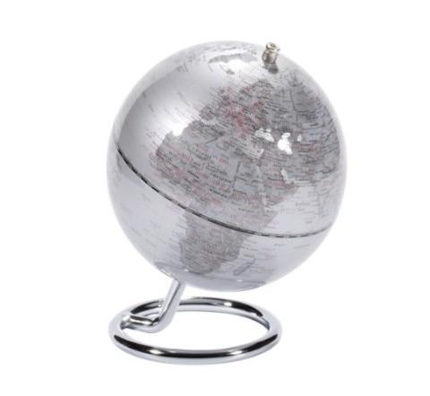 Globe with 13 cm diameter, chrome-plated, ring-shaped metal base, movable axis, metal / plastic, shiny, silver coloured