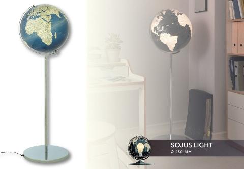- Attractive design: LED globe SOJUS LIGHT (43 cm diameter) with illuminated map image. The country areas are silver and the oceans are metallic blue. The globe is labeled in English and shows continents, countries, oceans, geographical zones, important cities and mountains.