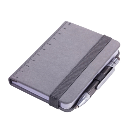 Notepad DIN A7 incl. ballpoint pen, elastic band fastener, pen loop, bookmark, embossed ruler (10 cm) on cover, FSC certified paper, 64 perforated sheets (128 pages), dot matrix, tray for documents, multitasking ballpoint pen CONSTRUCTION LILIPUT (small), black refill, imitation leather / metal, matt, Grey