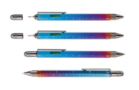 Multitasking ballpoint pen , centimetre-/inch ruler, 1:20 m and 1:50 m scale, spirit level, flat-head-/Phillips screwdriver, stylus (titanium colour), black refill, with colour gradient, brass, shiny, Multicoloured
