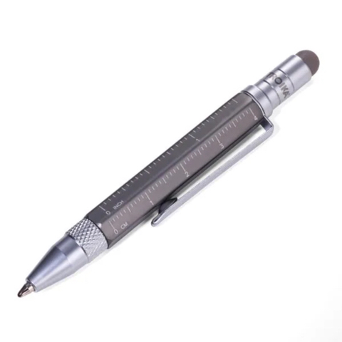 Multitasking ballpoint pen (small), centimetre and inch ruler, slotted and Phillips screwdriver, stylus (titanium colour), black refill, incl. 2 refills, aluminium / brass / steel, matt, Grey