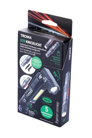 ECO KNICKLIGHT - very sustainable, long-lasting and environmentally friendly due to the ecological recharge function. Light head can be bent by up to 90° for optimal illumination. Can also be used on a belt clip or as a headlamp, splash-proof.