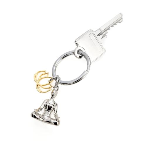 Keyring with 2 charms, woman in meditation posture and blossom of the lotus flower, cast metal, shiny