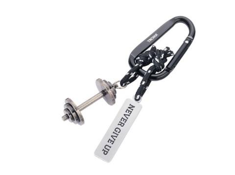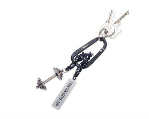 Never give up! With this message on the key ring in addition to the dumbbell charm, you have a daily reminder: I can do it, I can achieve the goals I have set myself, be it in terms of fitness, health or in other areas of life. Made from a zinc alloy, the dumbbell charm has a patina that conveys: I am in use. The two charms are attached to a practical carabiner with decorative cords.