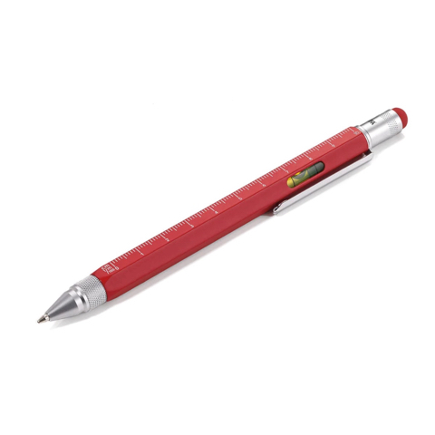Multitasking ballpoint pen , centimetre and inch ruler, 1:20 m and 1:50 m scale, spirit level, slotted and Phillips screwdriver, stylus, black refill, brass, Red