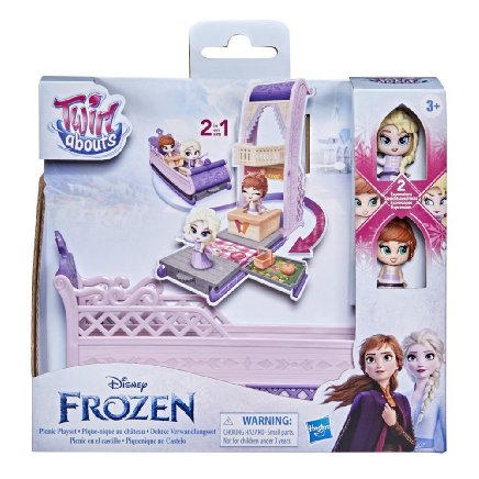 If your child likes surprises, they will love all the unexpected delights of this Disney Frozen Twirlabouts Picnic Playset. The small Elsa and Anna dolls bring big fun as their facial expressions change from sweet to sassy. Just turn the dial for the switch. Playtime gets more awesome with the sled that converts into a two-story castle for Elsa and Anna! Set the scene for a picnic with the accessories that also change. The pumpkin cake turns into 2 bowls with ears of corn, the plate with cookies flips to become a plate with crumbs, and the picnic basket turns over and folds into a tabletop. All Twirlabouts dolls and single vehicles are compatible with this playset so collecting Disney Frozen Twirlabouts toys means building a bigger, more bodacious Frozen world!