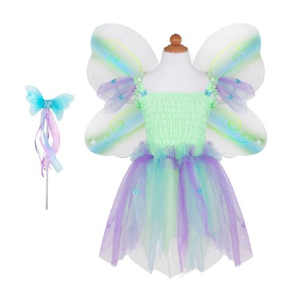 Great Pretenders™ Butterfly Dress, Wings, and Wand 3-pc Set. This beautiful dress, wings, and wand set will transform all little fairies to a wonderful land of fantasy and imagination. The bodice is fully ruched satin and provides comfort and size flexibility. The skirt features layers of sparkly petals adorned with iridescent butterflies and is fully lined. Adorable 4-pc wings are very comfortable to wear because they come with satin covered elasticized straps. A matching wand completes the look to work the magic! Machine Washable. Great Pretenders™ products are made with durable, premium quality materials and exceptional workmanship. This dress fits on the smaller side.