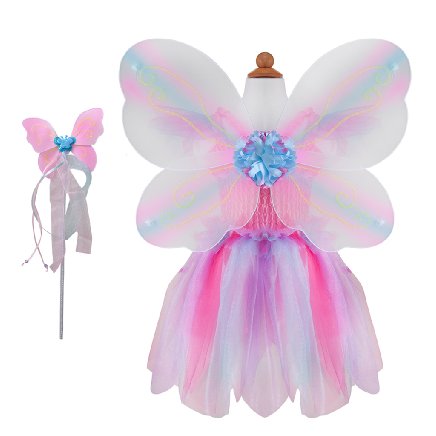 This Butterfly Dress, Wings & Wand set can transform any child into a beautiful butterfly instantaneously, no work required! A ruched satin top provides sizing flexibility matched with a glimmer tulle skirt decorated with iridescent butterfly decals. 4 piece glittery wings are easily worn with satin-lined elastic straps. Finally, a matching butterfly wand to work the magic!