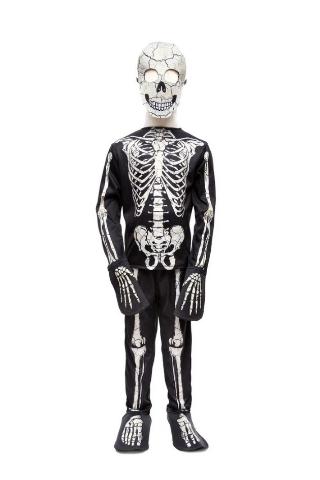 Made with high-quality materials, this set is not only comfortable to wear but also durable enough to withstand all-night trick-or-treating. The skeleton design is made using special glow-in-the-dark ink that is charged by light, giving you an otherworldly look in low-light environments. It's long sleeves & pants are great for bundling up and withstanding a Canadian Halloween!