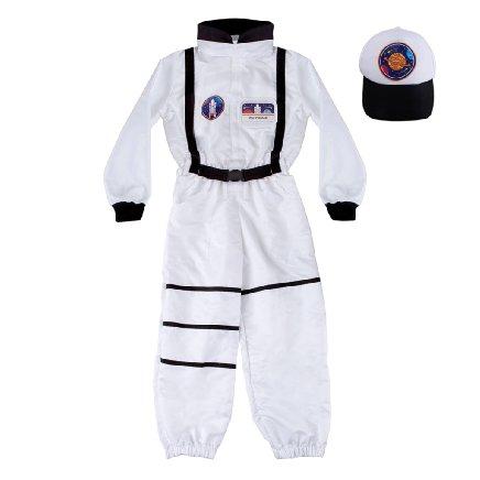 Beautiful Great Pretender costume which depicts an astronaut uniform in white with black details around the neck, stripes on the legs and black ribbons from the shoulders down to the waist. At the waist, there is a click buckle, and on the left side of the chests, there is a sign where the child can write his name on. On the right side of the chests, there is a fine print of a space rocket. A cap in white and black with a print of planets is included.