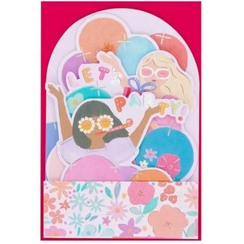 Festive and colorful pop-up greeting card, perfect for celebrating special occasions among friends. Includes three-dimensional details that open to reveal a lively party scene with girls dancing and having fun. Made with high-quality materials, this card is ideal for conveying joy and cheer.