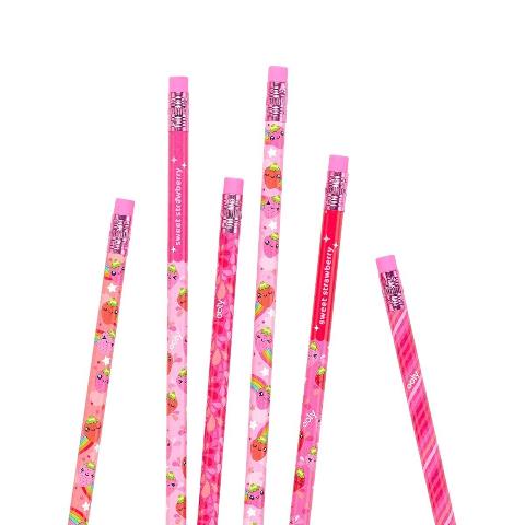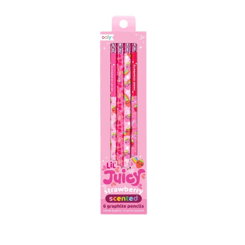 Each of the 6 strawberry scented pencils has its own fruit inspired patterns and designs. The secret to the fruity scent is in the barrel of these No.2 graphite pencils. To add to the cuteness pair with the Lil’ Juicy Scented Pencil Topper Erasers for double the strawberry scent!