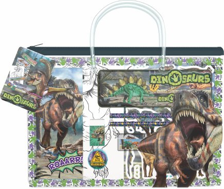 Packaging cozntains a metal pencil case, 6 colouring sheets, 2 sticker sheets, 2 pencils, pad, ruler, sharpener and eraser, everything in a sealable bag with fairy-tale motif.