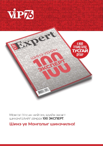 Ном›СэтгүүлШинэ үеийн 100 ЭкспертШинэ үеийн 100 ЭкспертМонгол Улсын нийгэм, эдийн засагт шинэчлэлийг авчрах бизнес, улс төрийн төлөөлөл болсон 100 экспертийг танилцуулсан, “ШИНЭ ҮЕИЙН 100 ЭКСПЕРТ” сэтгүүлийг эрхлэн гаргасан. Уг сэтгүүл нь дөрвөн жил тутамд гарах тусгай дугаар.Цааш уншихТанилцуулга