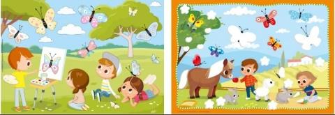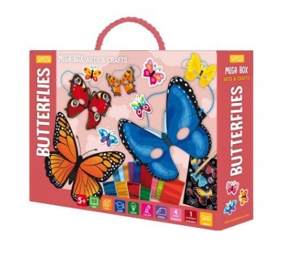 The mega box contains: One 32-page colouring book with giant stickers 4 masks to decorate and wear one butterfly rainbow to assemble 9 iridescent sheets 2 adhesive scenes for the iridescent paper 4 sticker sheets of iridescent squares 1 sheet of double-sided adhesive figures 2 scenes to decorate with the double-sided adhesive figures 4 scratch art sheets