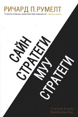 "“Сайн стратеги, муу стратеги” (Richard Rumelt) нь стратегийн тухай хамгийн нөлөө бүхий бүтээлүүдийн нэг бөгөөд байгууллага, улс төр, бизнесийн удирдлагад стратеги ямар утга агуулдаг, сайн стратегийг муугаас нь хэрхэн ялгах тухай өгүүлдэг. Зохиогчийн үзлээр сайн стратеги гэдэг нь тодорхой зорилтод төвлөрсөн, бодит нөхцөл байдлыг үнэнээр оношилж, цөөн чухал асуудалд хүчээ төвлөрүүлэн шийдэх үйл явц юм. Энэ нь цэргийн тактикийн адил давуу байдлыг бий болгож, өрсөлдөгчийн сул талыг ашиглах ухаан дээр суурилдаг. Сайн стратегийн гол тулгуур нь: нөхцөл байдлын оношилгоо, чиглэлийн үндсэн сонголт, хэрэгжүүлэх нарийн үйл ажиллагааны бодлого гэж гурван шатлалд багтдаг.