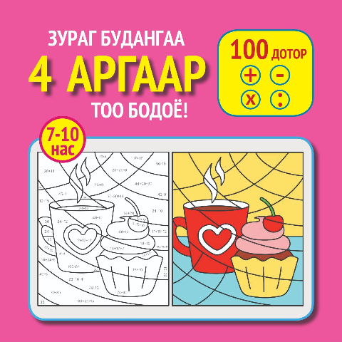 Хүүхдийг стрессдүүлж ядраалгүй, хөгжилтэй аргаар 1-100 хүртэл 4 аргаар /нэмэх, хасах, үржих, хуваах/ тоо бодуулж сургах, оюунлаг, хөөрхөн буддаг ном. 7-10 насны хүүхдүүдэд зориулсан. Номын урд хэсэгтээ 2-10 үржүүлэхийн хүрдтэй, дуурайж будах өнгөтэй, ард хэсэгтээ хариу болох будсан өнгөт зургуудтай, 2-10 хуваахын хүрдтэй.