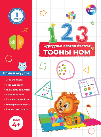 ' **123 Тоо** ' цуврал-1 нь хүүхдийн гар зүгшрүүлэх, зурлага зурах, 1-20 хүртэлх тоог таниулах, бичиж сурах, тоон дараалал болон хөрш тоог нүдлэх, хамгийн их, бага тоог ялгаж сурах, өнгөөр ялгаж будах, цэгийг тоон дарааллаар холбож зурахад тусална.